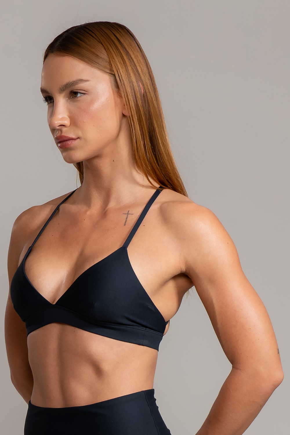 Minimalismo e impacto em uma só peça. O SKIN CROSS é o top que redefine a simplicidade, transformando-a em sofisticação. Sua modelagem triangular com alças finas e cruzadas nas costas cria um desenho elegante e feminino, valorizando a postura e destacando as linhas naturais do corpo com delicadeza. O elástico estrategicamente posicionado abaixo e em volta do busto oferece sustentação segura, sem abrir mão da leveza. Já as alças elásticas acompanham o movimento de forma natural, trazendo estabilidade em cada movimento.